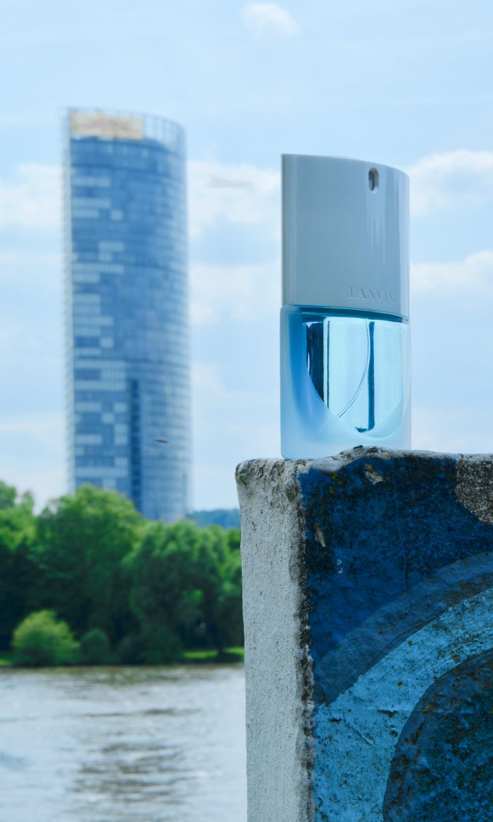 Die Form des Flakons und die des Hochhauses — die Rundungen der blauen Bemalung der Betonstele und die untere Flakonrundung —- und last but not least : alles in passenden Blautönen ! Perfekt eben !