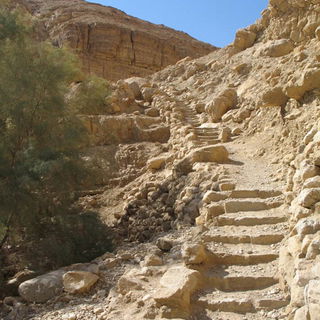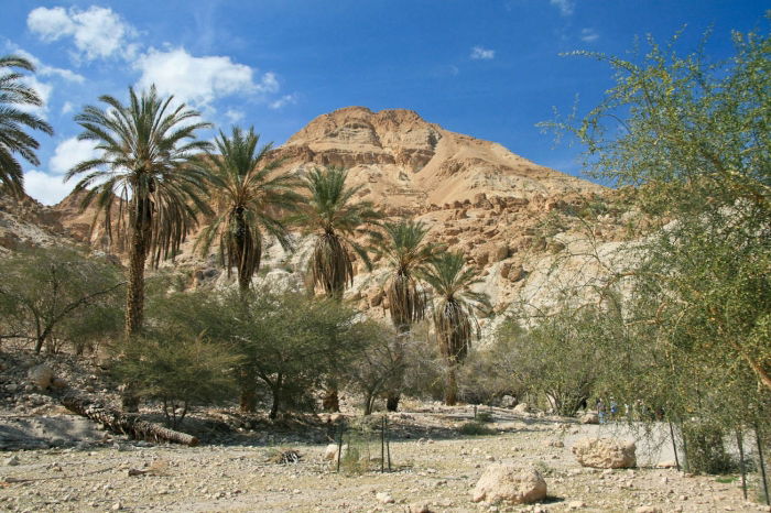 Die Strasse nach En Gedi führt am Toten Meer entlang. Seine Mineralien sollen heilende Wirkung haben, kein Wunder also, dass es für Gesundheits- und Kosmetikprodukte verwendet wird und Touristen aus aller Welt anzieht. Das Land um das Tote Meer herum ist völlig ausgedörrt, abgesehen von einer Oase, in der früher die Stadt En Gedi stand.