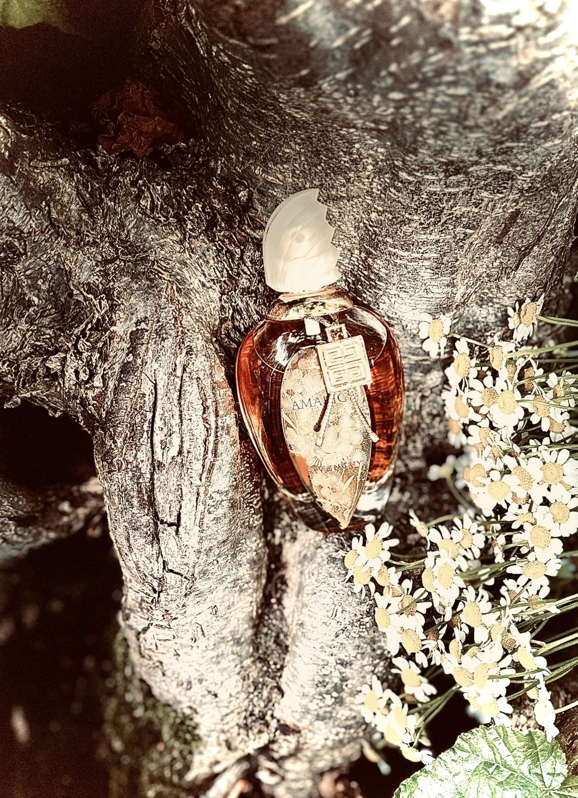 Der schöne Flakon passt sehr gut zur Baumrinde. Oder umgekehrt 😉