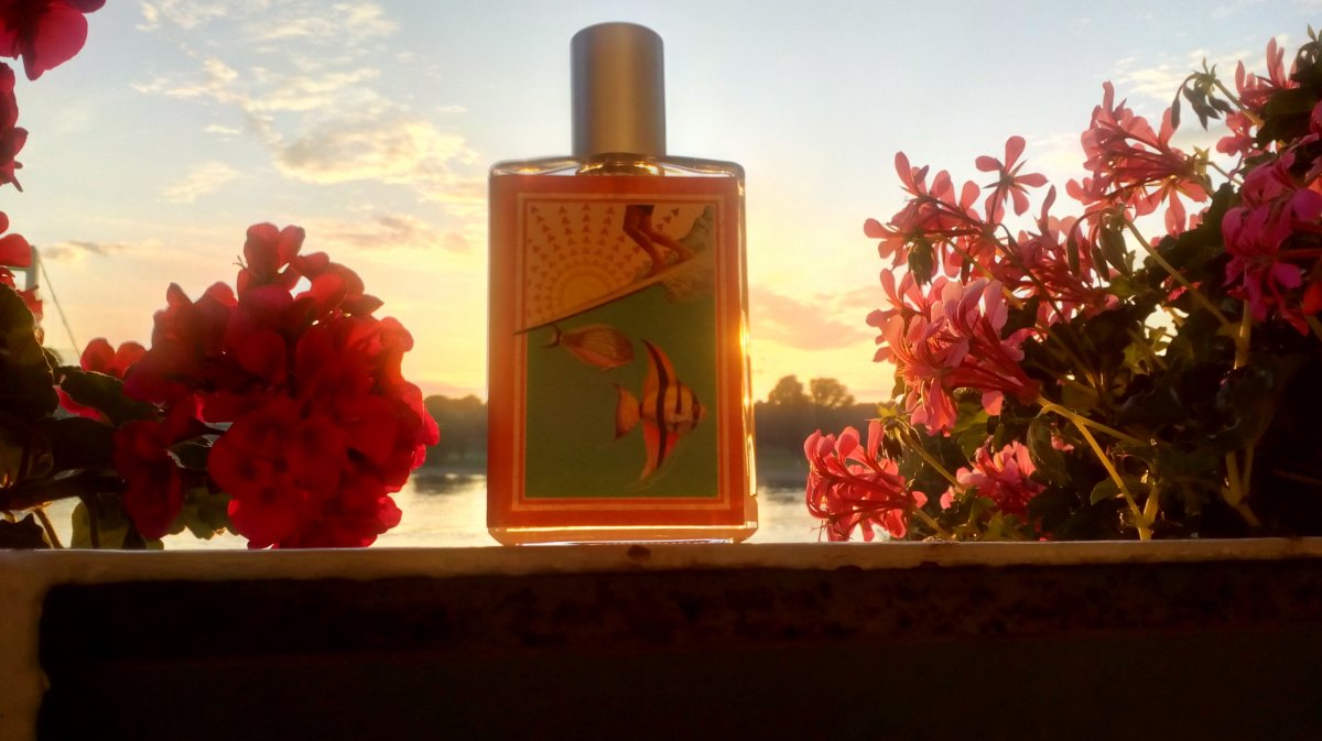 Blumen und Flakon wirken tatsächlich ziemlich sonnentrunken - fein und geschmackvoll umgesetzt.
