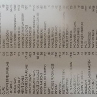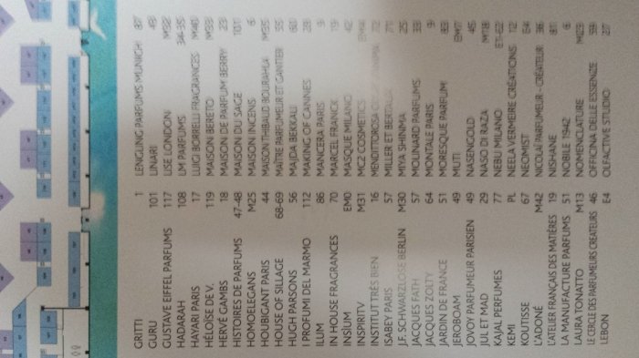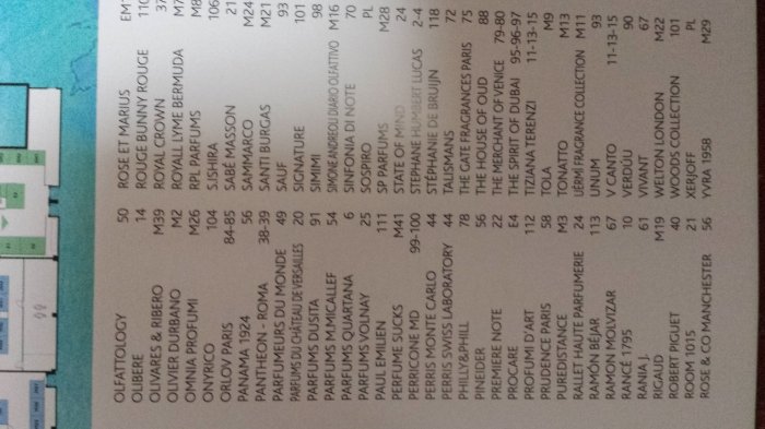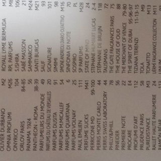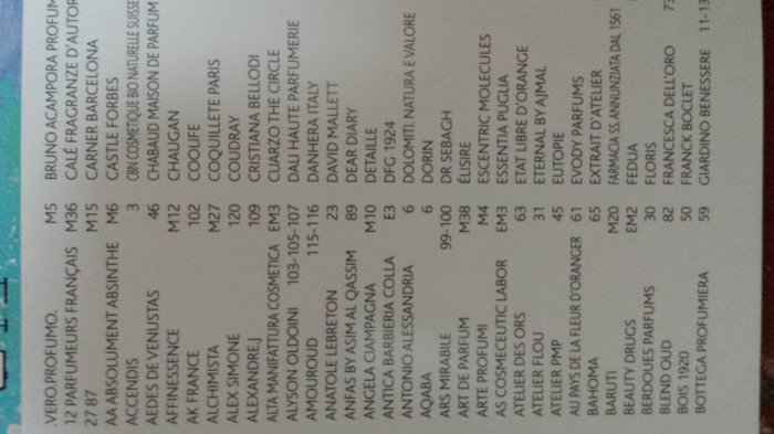 Im Anschluss an meine Impressionen habe ich drei Fotos der Ausstellerliste eingestellt, um einen Eindruck von der Groesse der Esxence zu vermitteln. Das ist nicht irgendeine kleine Parfummesse mit 30 / 40 Countern. Nein in Mailand wird nicht gekleckert, sondern geklotzt, was Namen und Anzahl der teilnehmenden Parfumhaeuser angeht. Nun mag einer fragen, wo all die Guerlains, Kurkdjians und Roja Doves sind; ganz einfach - die fehlen und es faellt keinem auf. Also mir faellt es schon auf, aber das ist nur ein kurz aufblitzender Gedanke, der in Anbetracht der Fuelle dessen, was es alles zu erkunden gibt, auch sofort wieder verschwunden ist.