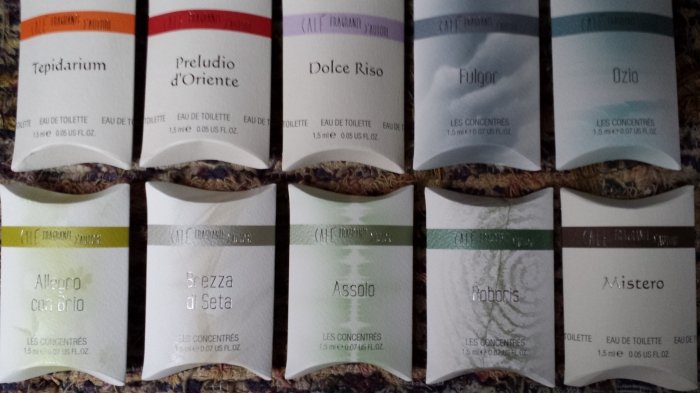 Nehmen wir zum Beispiel das kleine italienische Parfumhaus CALE - FRAGRANZE D'AUTORE. Ich hatte noch nie davon gehoert. In so einem Falle schaue ich immer gleich auf Parfumo.de nach, ob sie gelistet sind. Und waehrend die Suchfunktion noch ihre Arbeit tut, denke ich immer, also die sind bestimmt nicht gelistet - und schon spuckt sie das jeweilige Parfumhaus mit saemtlichen Dueften aus. So auch bei CALE - FRAGRANZE D'AUTORE. Aber was soll's, im Vordergrund steht schliesslich die neue Dufterfahrung, das sogenannte Promiriechen fuer die Nase. Und da hat CALE - FRAGRANZE D'AUTORE wahrlich was zu bieten. Laut Parfumo.de hat dieses Haus insgesamt 11 Duefte und von 10 habe ich tolle Proben zum Testen mit nachhause bekommen. Die gesamte Reihe ist unterteilt in Eaux de Toilette und Les Concentrés und deckt so ziemlich saemtliche Duftfamilien ab. Schon allein die Namen der Duefte zeigen einmal mehr, warum Italien als DAS Land fuer Kreative gilt. Die Duefte haben Namen wie "Tepidarium" oder "Allegro con Brio" (Lustig mit Schmackes) und die Kreativitaet zeigt sich sehr wohl auch in der Komposition selbst. Ich hatte mich dafuer entschieden, "Tepidarium" zu testen und zwar gleich auf der Haut. Die Signorina vom Stand hatte mir dazu erklaert, dass es sich bei "Tepidarium" um einen frisch-fruchtig- aquatischen Duft handle. Wer jetzt allerdings aquatisch liest und gleich an Cool Water denkt, koennte nicht falscher liegen. Hier handelt es sich nicht um einen "Klostein-Knaller", sonder fast um einen zart daherkommenden Aquaten, dem Rum und Pina Colada beigemischt sind. Besoffen kann man allerdings nicht davon werden, denn alles ist sehr ausgewogen, erinnert auch ein wenig an einen Teeduft à la "Tea for Two" mit etwas Rum. Sehr schoen gemacht und auf jeden Fall einen Kommentar wert, zumal ich noch nichts ueber die Halbarkeit sagen kann.