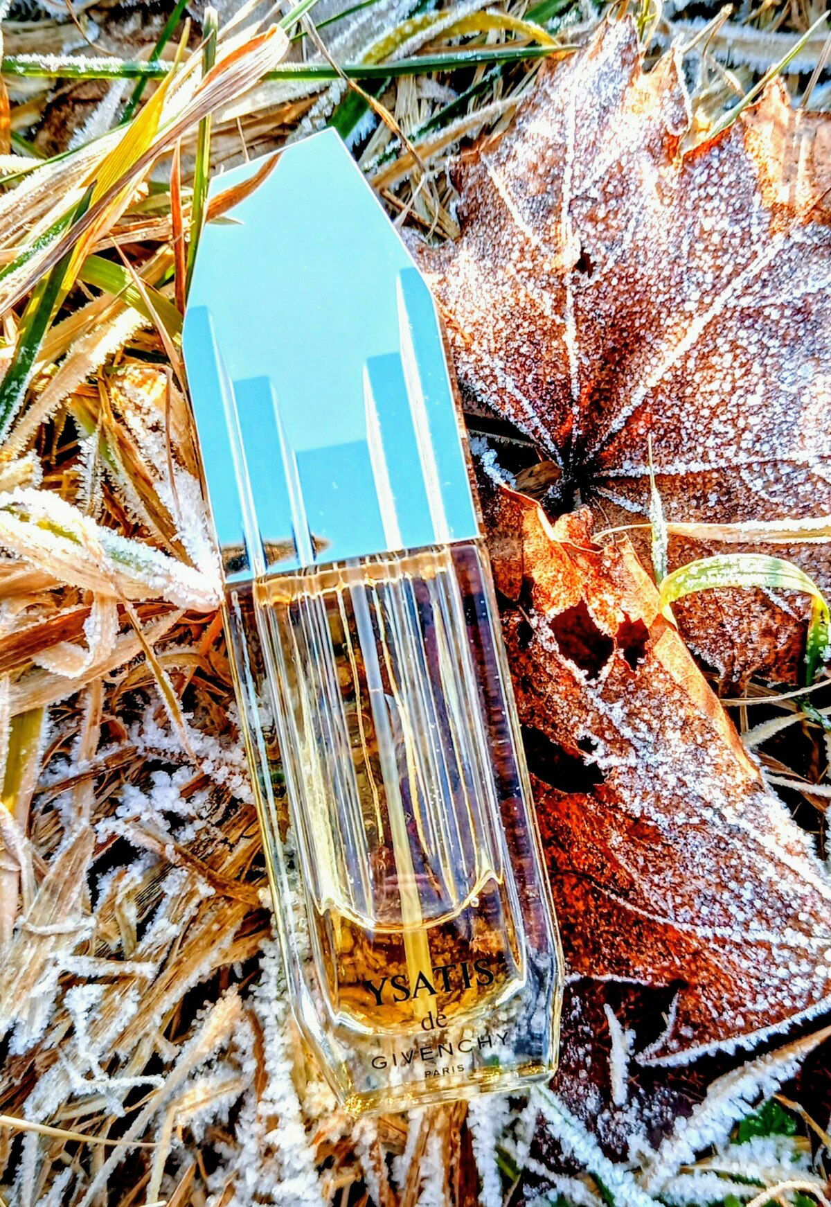 Der Flakon wirkt wie ein Stück Eis auf den Frost-Blättern. Total schön.