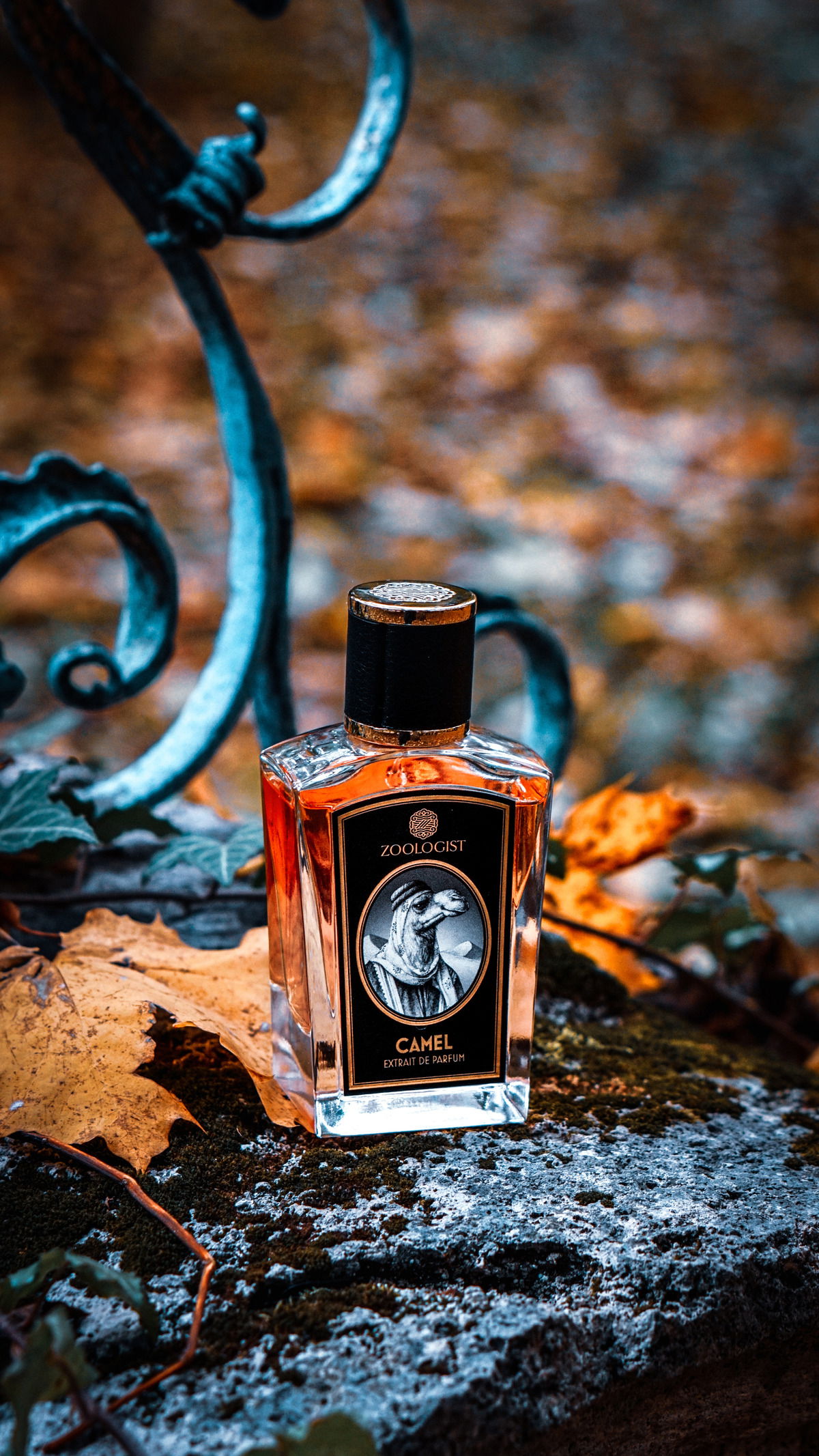 A camel in the autumnal forrest tied to the gate of your masion!