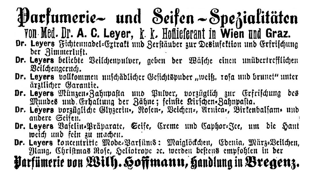 Ein Parfum von A. C. Leyer für Damen, erschienen im Jahr 1885. Die Produktion wurde offenbar eingestellt.