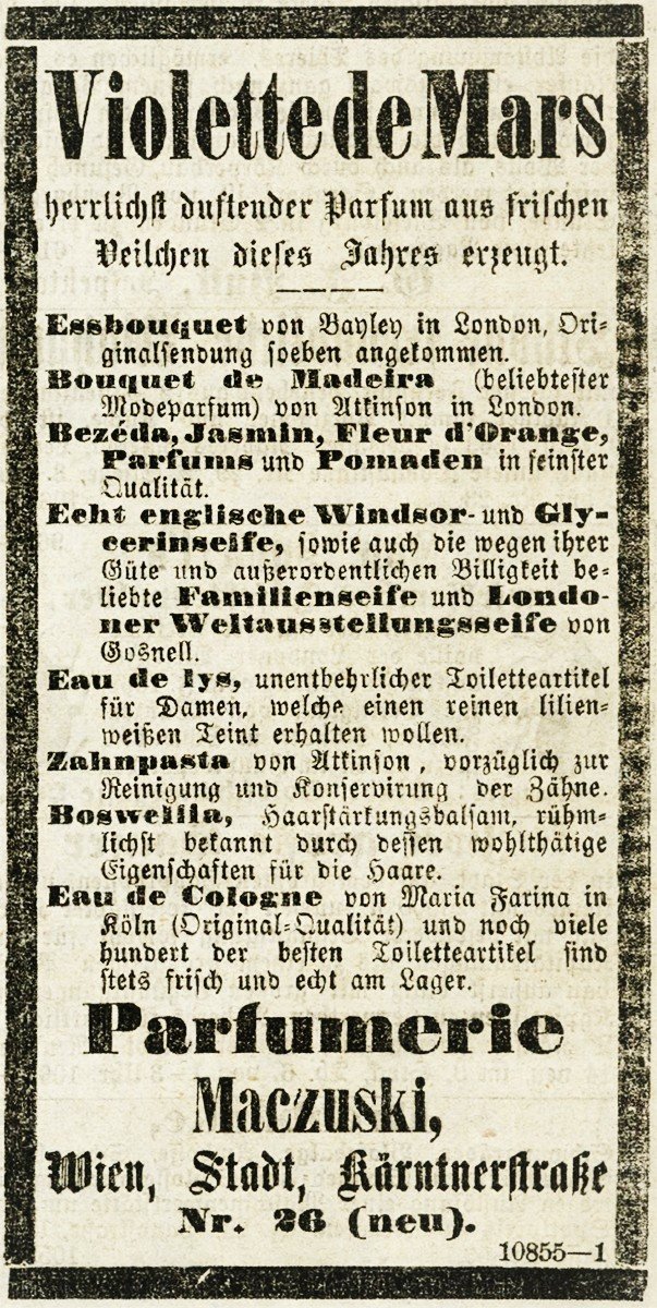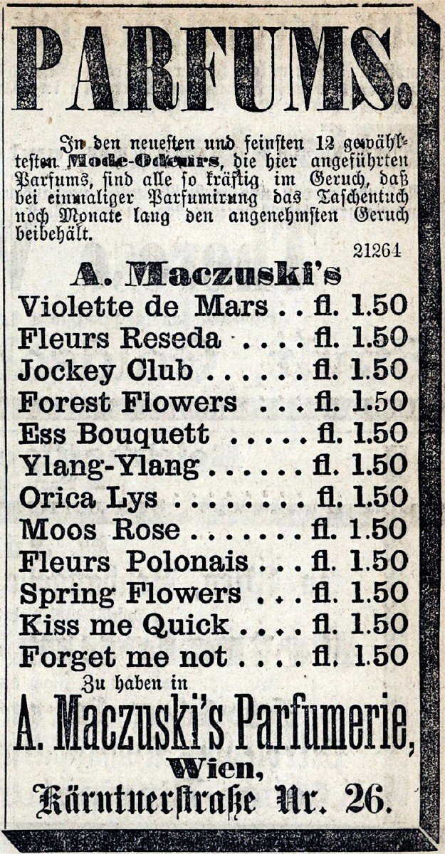 Ein Parfum von A. Maczuski für Damen, erschienen im Jahr 1863. Die Produktion wurde offenbar eingestellt.