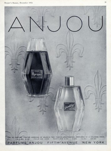 Wer oder was ist Anjou? Viel gibt es leider nicht herauszufinden, doch Anjou war waschechter Argentinier! Sicher gab es Dépandancen in Großstädten auf dem amerikanischen Kontinent, wie z.B. in New York, doch der Ursprung war in Argentinien. Die Flakons hatten alle die gleiche Form - sie erinnern an einen geschliffenen Edelstein.