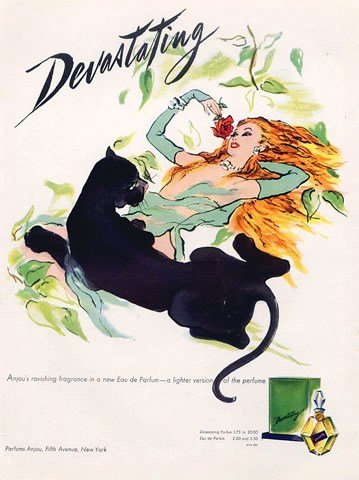 Die Werbung für Devastating war für die damalige Zeit teilweise schon recht gewagt. Eine nackte, oder zumindest barbusige, Dame wird von einem Tiger lüstern umarmt. Ein Foto wäre dennoch zu gewagt gewesen, also "verharmloste" man es ein wenig durch eine Zeichnung.