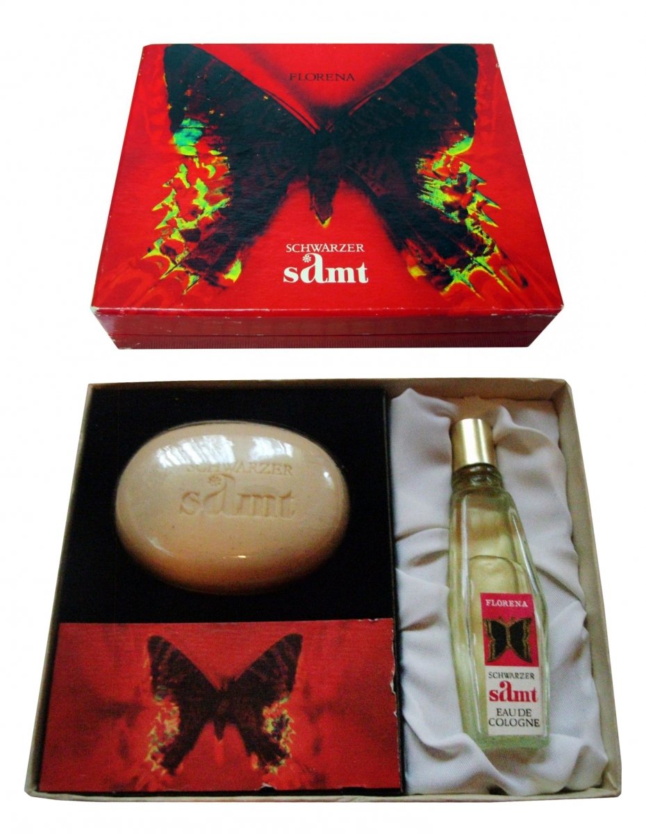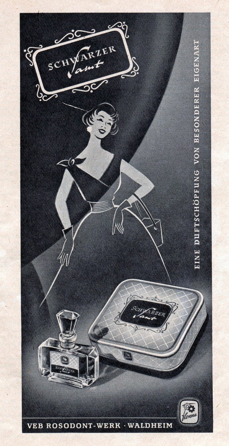 Für 'Wir hatten ja nüscht' (ihr Lieblingssatz, wenn es um irgendwas vor 1990 geht) riecht Schwarzer Samt nach ganz schön viel. Ich würde behaupten, der Inhalt jener Flasche war noch gut (die Verkäuferin wollte vierzig Euro für das halbvolle, kleine Fläschchen haben und hat mich nur sehr widerwillig testen lassen) - und roch so gar nicht, wie man sich als Wessi den Duft der DDR vorstellen würde (wobei ich jetzt auch nicht sagen könnte, was ich denn erwartet hätte). Schwarzer Samt riecht weder übertrieben dunkel, geschweige denn nach Samt, sondern ist ein schwerer, schwüler Blütenduft mit Rose (mit einem deutlichen Altton, vielleicht war er doch schon leicht hinüber) und einer chyprigen Basisnote, die sich nicht wesentlich von mir bekannten (westlichen) Parfums unterscheidet. Ganz spürbar kein Parfum der Gegenwart, aber nichts charakteristisch realsozialistisch Duftendes.