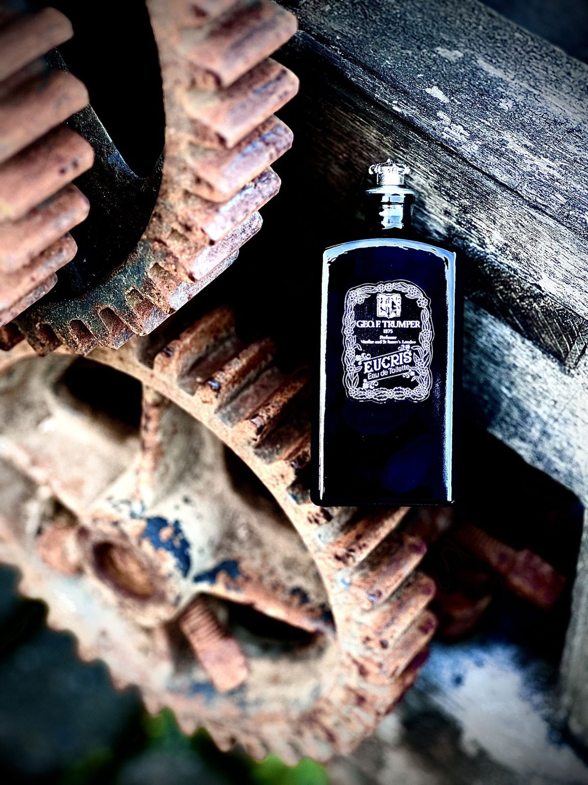 Was die Akzidentia, a.k.a. das Drumherum zu Trumpers 'Eucris' betrifft, sind schon mehrfach seine James-Bond-Bezüge erwähnt worden: Angeblich taucht er in einem Film als Bond-Duft auf; in einem Roman wiederum findet Bond Eucris im Badezimmer eines Bösewichts. Auch das über 100-jährige Alter des Rezepts und der blickdichte schwarze Flakon mit dem ungewöhnlichen Ausguss - einer Art Stahl-Hohlnadel - waren schon Thema.