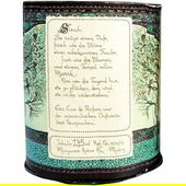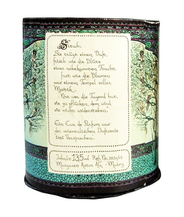 Das Gefäß, ein Handschmeichler. Schwer, und mit eingeschliffenem Glasstöpsel. Die Verpackung widerspiegelt die Lieblichkeit und gleichzeitige Sinnlichkeit des Duftes (siehe Foto unten).