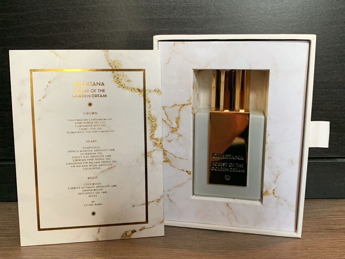 Wenige Düfte lösen in mir direkt ein Bild, eine Szenerie im Kopf aus. Forest of the Golden Dream ist einer hiervon. Bereits beim ersten Riechen sah ich mich in eine Waldlichtung versetzt. Frische Luft, spürbares Grün, Kiefernnadeln. Die Sonne scheint sanft wohlig durchs Geäst und lässt die Konturen golden schimmern. Ich bin ganz bei mir, die Gedanken klar, Zuversicht, Freude auf das was kommen mag.