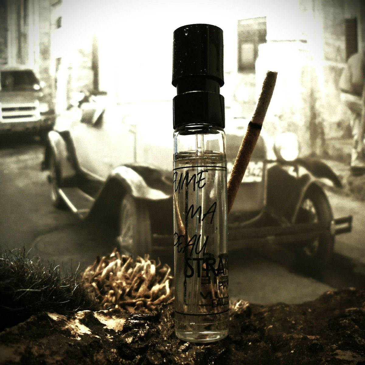Leim,Klebstoff,Lack,Benzin,zähen Asphalt und heißen Gummi lässt uns manchmal die Nase heben voller Faszination darüber. In solchen Momenten fragt man sich oftmals selber: Warum? Es hat schon seinen Grund warum diese Stoffe süchtig machen! Es sind Gerüche völlig konträr der Natur,aber trotz alle dem finden wir sie anziehend. Fume Ma Peau Ist eine Hommage an den 1967 gedrehten Film Week-end. Der chaotische Duft der Stadt,der Hektik und der Autos. Fume Ma Peau duftet wie ein Auto. Sowohl von innen,von außen und bei voller Fahrt. Es duftet nach Benzin und erwärmten Lack. Nach gewachsten Ledersitzen und holzig-verleimten Armaturen. Nach öligen Teer und dampfenden Gummi. Und nach Zigarettenrauch und Abgasen. Wie und mit was Prin Lomros diesen Duft gemacht hat spielt fast keine Rolle. Aber eines ist gewiss,er hat eine enorme Anziehungskraft auf sein Umfeld,wie ich beim tragen gemerkt hatte. Das Parfum verström eine bizarre Art von synthetischer Erotik. Vergleichbar mit den künstlichen Pheromonen die ein neues Auto verströmen kann oder auch ein sehr altes. Eine Art Kickstarter aus Adrenalin!