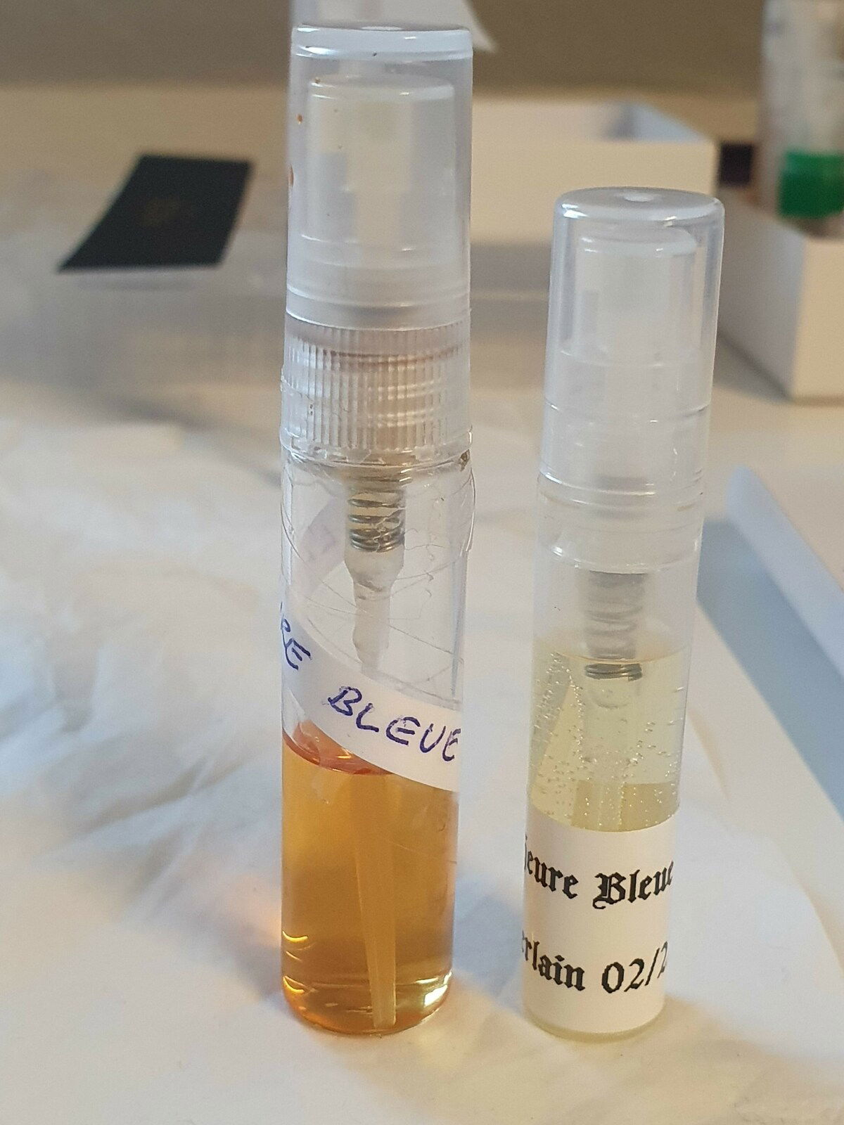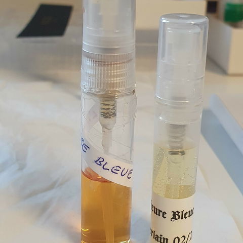 L'Heure Bleue Eau de Parfum Proben links (Paket) und rechts (von mir). Wahnsinn wie die linke Probe nachgedunkelt ist. Sie riechen aber nahezu identisch (schön) 😊