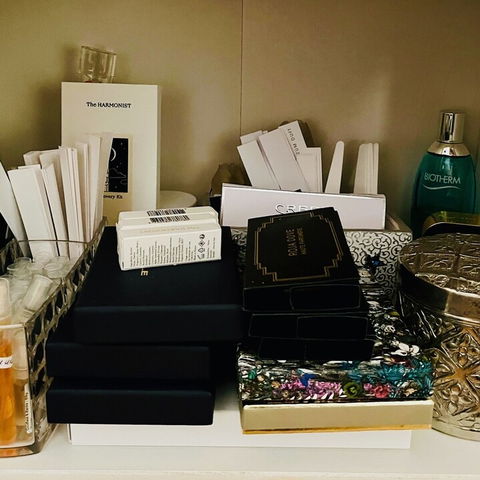 Ich bin auch noch nicht so lange dabei, daher ist die Sammlung noch klein, aber ich liebe sie alle... 🥰 Die Probensammlung wächst auch stetig, und die schönen Kartons kann ich leider nicht wegwerfen, also landen sie auch im Regal... 😁