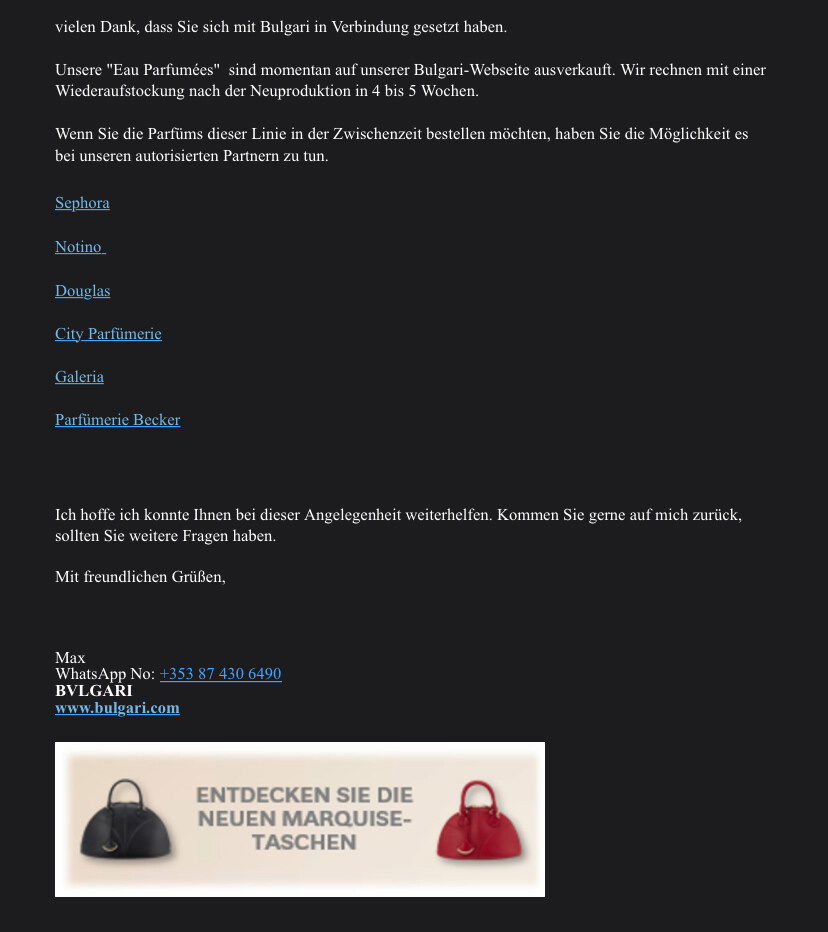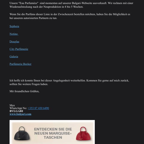 Weiß jemand etwas Genaueres über die "Eau Parfumée" Reihe von Bvlgari? Unter "Düfte" wird sie auf der Webseite anzeigt, aber wenn man drauf klickt, kommt eine Meldung, dass nichts gefunden wurde. Wäre schade, wenn diese Reihe eingestellt werden würde...