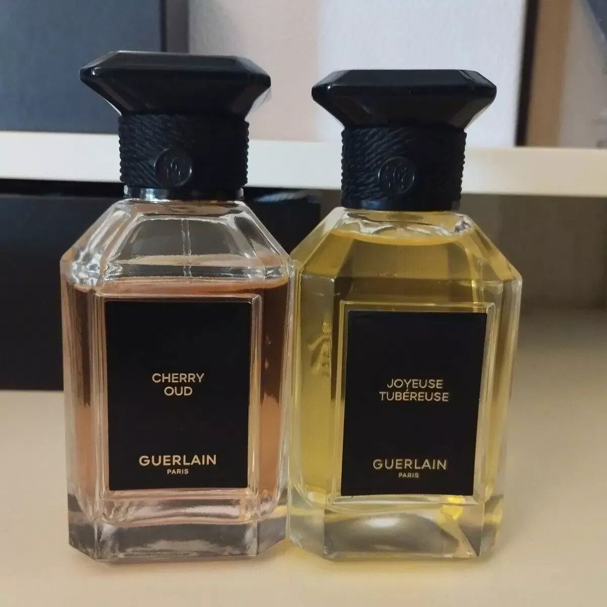 Cherry Oud, das dickere glasteil wo die flüssigkeit von unten anfängt ist anders als der Cherry oud und anders als alle meine Guerlain flakons und das innere vom Deckel sieht auch anders aus als meine Guerlain Deckel, deins scheint gelasert zu sein, aber sollte es nicht.