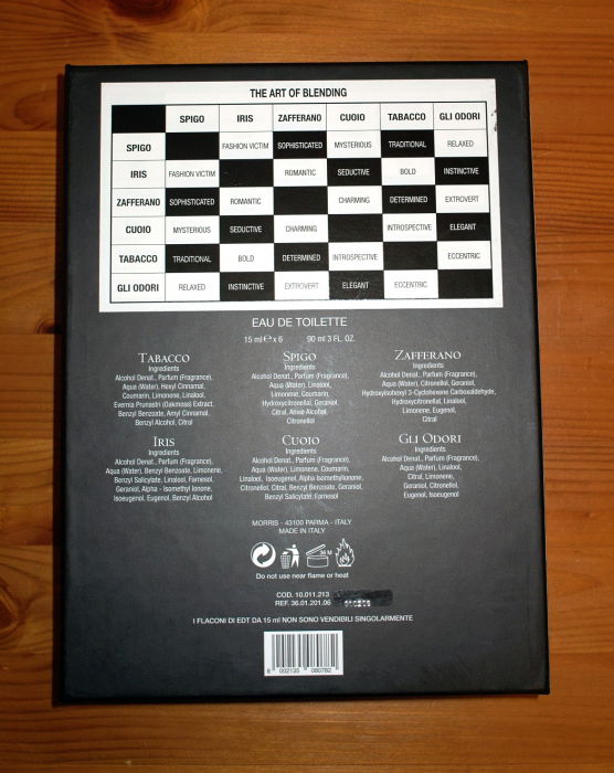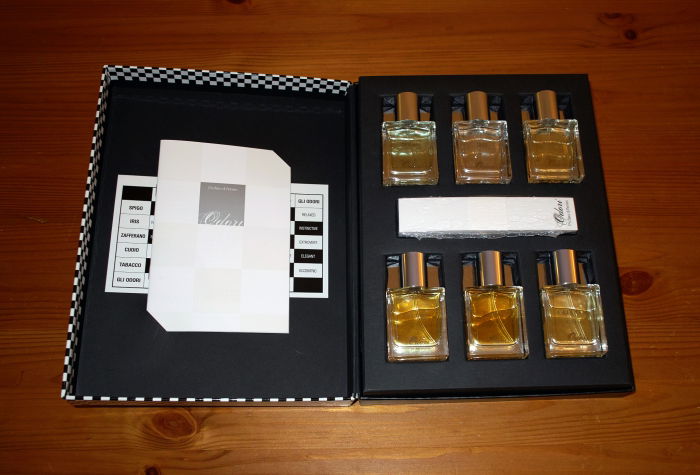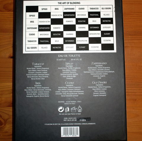 Das Set enthält jeweils einen 15ml-Flakon aller sechs Düfte, 50 Teststreifen von Morris, die Layer-Matrix und ein Werbebooklet. Die Marke "Profumo die Firenze Odori" wurde zu diesem Zeitpunkt vertrieben von der Morris Profumi SpA, 1946 in Parma von Giovanni Borri gegründet und seit 2010 Teil der Perfume Holding Group.